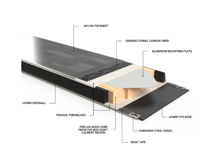 On top of that, we rethought the construction: an aluminum mounting plate now provides reinforcement underfoot, and the full-length carbon layer has been replaced with a 100 mm carbon strip—reducing the ski’s carbon footprint compared to the previous version while increasing its durability. The result? A ski that’s exceptionally agile, versatile, and tuned to meet a wide range of skiing styles and terrain types